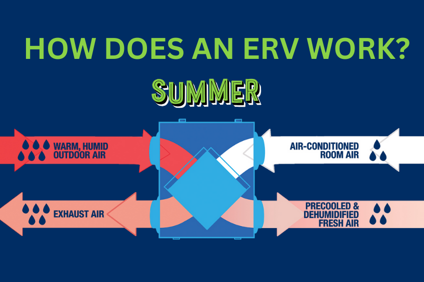 An ERV is a ventilation system for the entire house that will keep the air in your home healthy and safe. This system provides your home with fresh air when desired while reducing energy loss when indoor air leaves your house. This system works in both summer and winter to improve indoor air. In the summer the humid warm air coming in from outdoors is precooled and dehumidified, and in the winter, the outdoor cold dry air is preheated and humidified. This enables your HVAC system to work less.