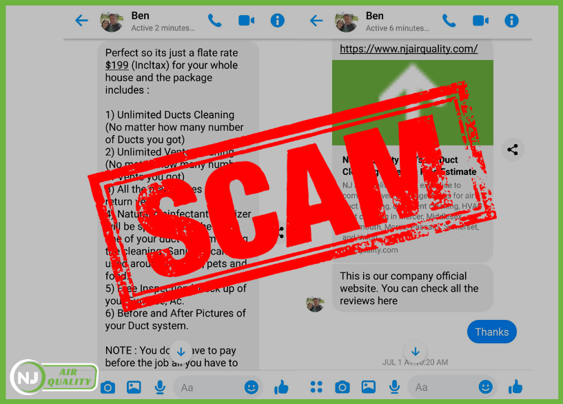 Let us get back to the original scam in which an estimate for duct and vent cleaning was given at a ridiculously low price. At our company, NJ Air Quality Duct Cleaning, we personally come to your home or office building and check the vents, ducts, and everything else relative to our service and give each potential customer an individual estimate. We are prompt and reliable as far as showing up for an estimate or a job. Fortunately, the scammer who used our exact name and email address did not end up showing up to the job. These scammers come to your place of business or home and check it out exhaustively. What could be a better way of getting intimate knowledge of your home than to check out your air conditioning vent and duct systems? No potential customer will ask why the estimator is going through closets, attics, basements, and every single room in the house. Isn’t that what a conscientious air duct cleaning company would do?