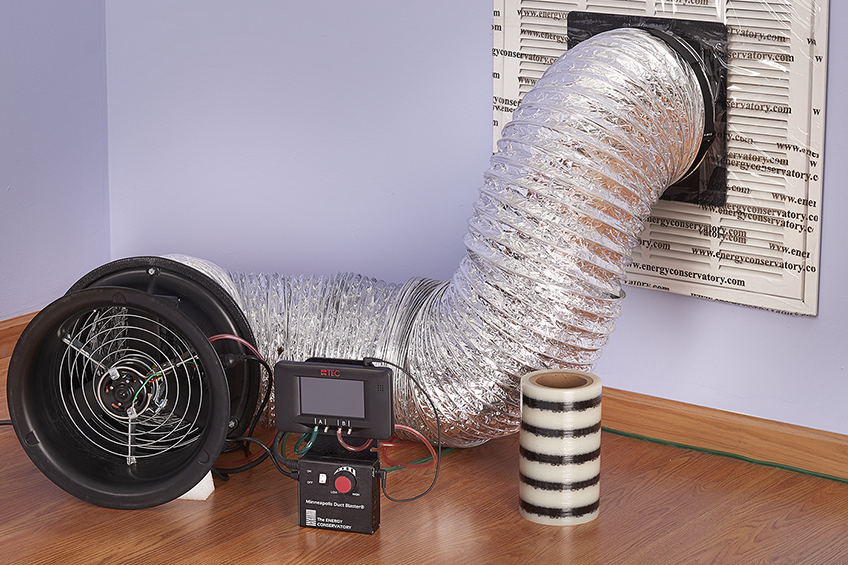 When you have located yourself someone who is certified, they will first begin by making sure all the openings to the air ducts are sealed with temporary register sealing tape. This tape is placed over all the registers and grills in the home leaving only the air handler cabinet exposed. The fan will then have a snorkel that is affixed to the air handler cabinet without any air escaping the face plate. It’s very important to use temporary register sealing tape and not to use duct or gopher tape to avoid damage being done when the tape needs to be removed.